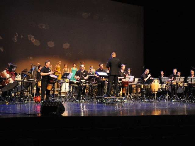 for 12 percussionists, 9 female singers/dancers & bass guitar